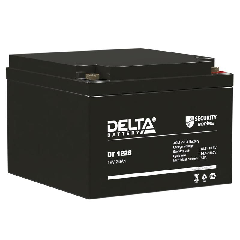 Аккумуляторная батарея Delta DT 1226. Напряжение 12В, емкость 26Ач. Имеет низкое внутреннее сопротивление и высокую плотность энергии. Предназначена для охранно-пожарных систем и СКУД. Срок службы 5 лет.