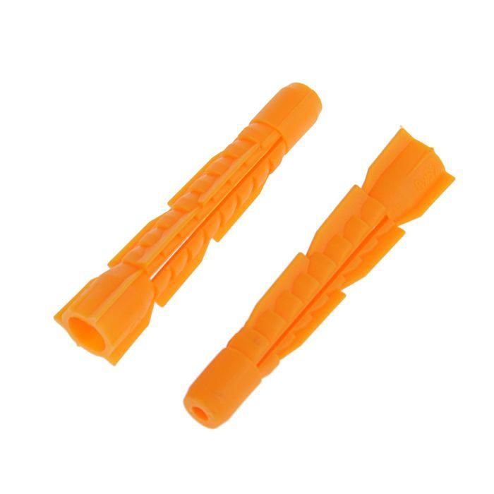 Дюбель универсальный работает за счет распора, а в пустотелых и листовых материалах скручивается в плотный узел и фиксируется в виде «якоря» с внутренней стороны. Отсутствие бортика у дюбеля позволяет закреплять деталь вровень с поверхностью основания. Изготовлен из полипропилена. Острые зубцы на распорной зоне предотвращают проворачивание дюбеля при установке. Дюбель используется совместно с универсальными шурупами, сантехническими болтами, шпилькой-шурупом и т.д.