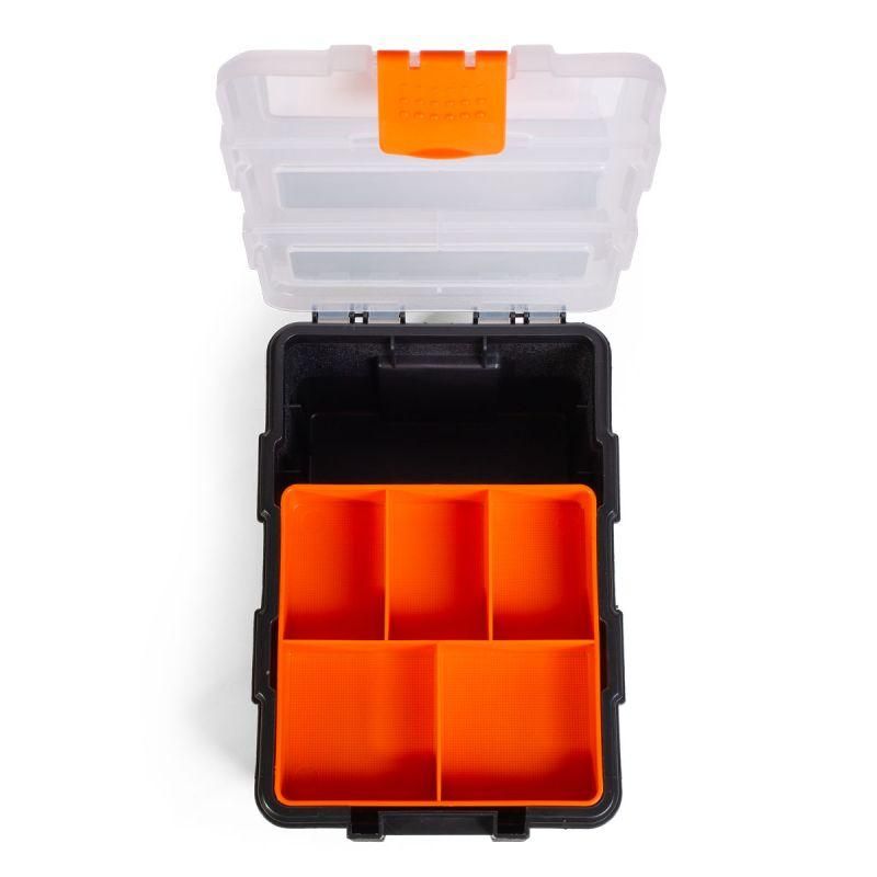 • Пластиковый кейс-органайзер без разделителей для хранения мелких предметов • В комплекте: • пластиковый кейс • съемный модуль с 5 отделениями • Размеры основного отделения: • 130х195х110 мм • Размеры съемного модуля: • 128х128х25 мм • Крышка кейса открывается на 180° • Прозрачная крышка кейса позволяет с легкостью идентифицировать содержимое • Плотное прилегание крышки исключает пересыпание содержимого из отсека в отсек • Надежный замок из ABS-пластика для фиксации крышки кейса • Габариты кейса: 156х228х116 мм • Вес: 0.32 кг