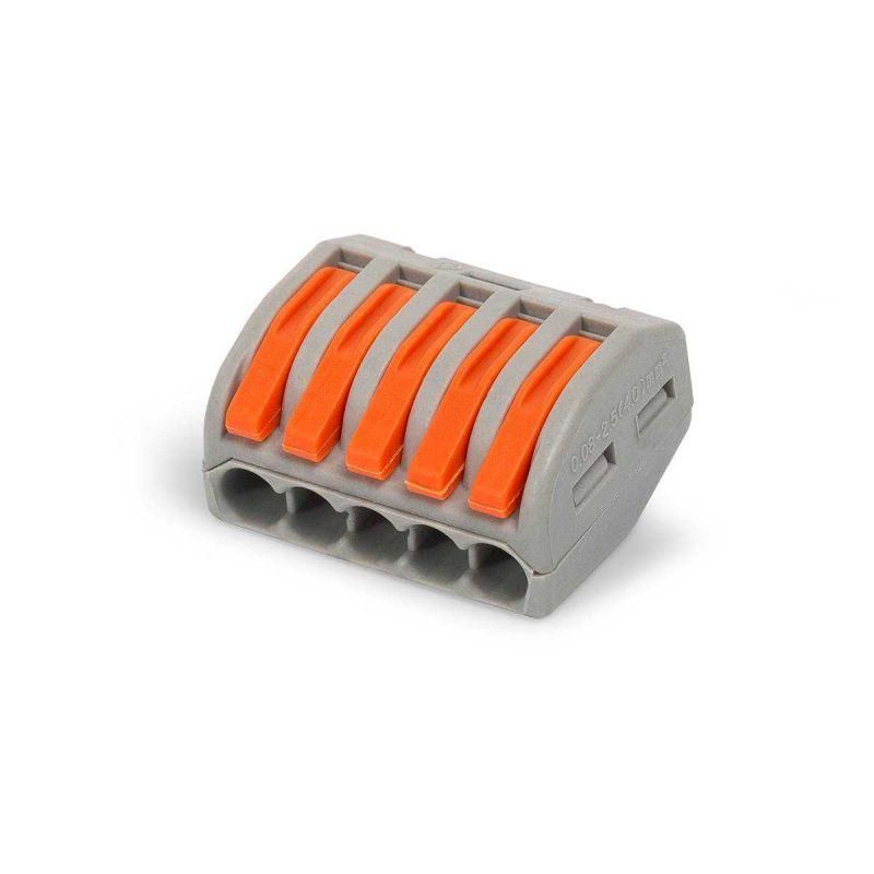 • Универсальные изолированные клеммы для подключения любых типов медных проводников: моножильных и многожильных тонкопроволочных • Зажим проводов в клемме осуществляется при помощи оранжевых рычагов • Наличие специального паза в корпусе клеммы для размещения рычага в закрытом положении надежно предотвращает случайное отсоединение проводника • Возможность измерения электрических параметров цепи без разбора и нарушения изоляции соединения • Безопасность и порядок в распределительной коробке • Максимальное напряжение: 450 В