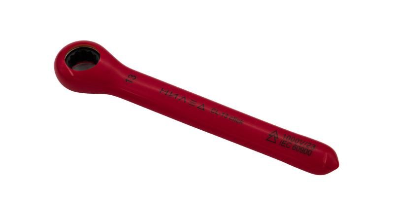 Ключ накидной храповой(трещоточный) изолированный используется для откручивания и закручивания болтовых соединений на распределительных устройствах, кабельных и воздушных линиях. Трещоточный механизм позволяет применять ключ в ограниченном пространстве, обеспечивая высокий крутящий момент. Инструменты, изготовлены в соответствии с ГОСТ IEC 60900-2019 - способствуют повышению безопасности пользователей в случае их применения квалифицированными специалистами в соответствии с безопасными методами работы и инструкциями по эксплуатации (при необходимости). Материал головки - CrMo Материал рукояти - CrV Материал изоляции - PVC (пластизоль) Твердость головки - 52-56 HRC Твердость рукояти - 42-50 HRC Размер головки, мм - 13