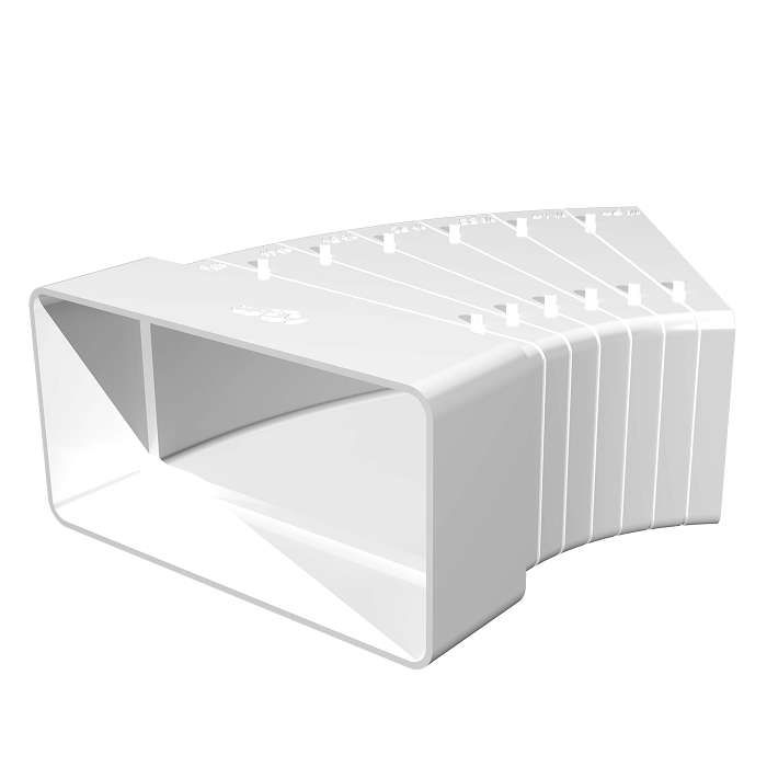 Колено плоское 55х110мм горизонтальное 511КРП изготовлено из пластика, который не меняет цвет и не подвержен старению. Материал обладает такими качествами как ударопрочность, стойкость к агрессивным щелочным и кислотным средам, атмосферным явлениям и относится трудновоспламеняемым материалам. Изделие выдерживает частые перепады температуры, контакт с жаром, влагой - этого достаточно, чтобы установить ее на кухне или в ванной комнате, где присутствуют данные факторы. Колено пластиковое Era 511КРП представляет из себя ничто иное, как фасонный элемент воздуховода плоской формы, обеспечивающий всевозможные перемены в направлении потока воздушных масс. Для соединения воздуховодов соответствующего сечения под углом от 3° до 48°. В зависимости от выбранного угла одна сторона соединителя подрезается. C каналами соответсвующего сечения соединяются напрямую.