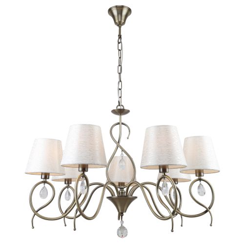 Rivoli Beatrix – коллекция классических люстр и бра для гостиной, спальни, загородного дома, ресторана, гостиницы. Артикулы для поиска: 2067-305, 2067-307, 2067-401. Коллекция создана итальянскими дизайнерами. Её отличительные особенности: декор в виде хрустальных подвесок, окрашивание металлического корпуса в цвет античной бронзы, рожки в виде завитков с плавными формами, белые тканевые плафоны в формате абажуров. Данная люстра потолочная под 7 ламп Е14 40 Вт освещает площадь до 21 м2. Подвес люстры можно отрегулировать по высоте при монтаже на потолок. Ткань плафонов грязестойкая, не собирает пыль и легко моется. Дизайн элегантных рожков люстры напоминает узелки. Корпус из прочного лёгкого металла.