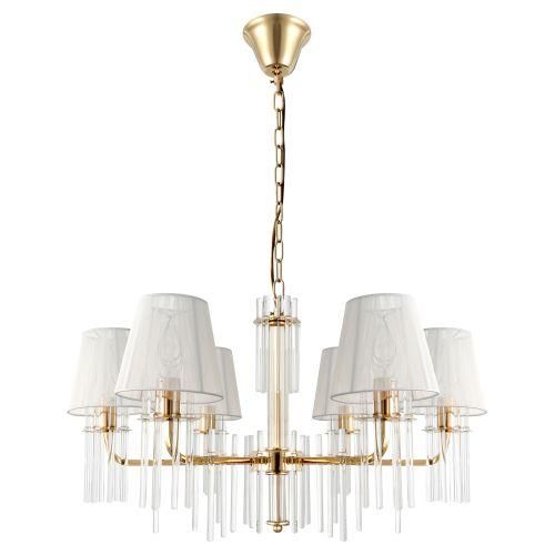 Rivoli Lilith - большая подвесная люстра в стиле современная классика. Итальянская коллекция Lilith Rivoli, в которую входят люстры потолочные под 6 и 8 ламп (арт. 1039-306, 1039-308) и настенное бра (арт. 1039-401), изготовлена из высококачественного легкого металла и декорирована удлиненными стеклянными колбами. Цвет люстры Lilith - французское золото - теплый и уютный. Лаконичные формы арматуры подходят для современных интерьеров, стремящихся к минимализму. Плафоны люстры из прочной прозрачной ткани хорошо пропускают свет. Люстры на потолок Rivoli Lilith c 6 плафонами освещают площадь до 18 м2. Люстры под 6 ламп Е14 40 Вт подойдут для основного освещения гостиной, спальни, детской, кабинета, квартиры-студии. Декоративные элементы отличаются выверенной формой, простотой и высокой прозрачностью под хрусталь. Люстры в спальню Lilith Rivoli помогут создать интерьер в классическом стиле, в замковом стиле, в стиле модерн, эклектика. Идеальны для загородного дома, холла гостиниц, ресторанов.
