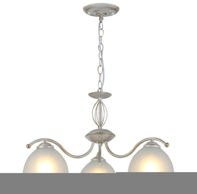 Люстры и светильники в классическом стиле Rivoli Valerie: люстра под 3 лампы – арт. 9169-303, люстра под 5 ламп – арт. 9169-305, бра – арт. 9169-401, настольный светильник – арт. 7169-501. Данная модель – люстра потолочная подвесная с 3 стеклянными матовыми плафонами белого цвета. Корпус люстры с декоративным состариванием окрашен гальваническим способом в белый цвет. Подвес люстры декорирован цепочкой, убрав звенья которой, можно легко отрегулировать высоту люстры при монтаже на потолок. Уютный свет люстры без бликов достигается применением матового стекла при изготовлении плафонов. Источники света в эту современную люстру классического стиля – Е27 40 Вт.
