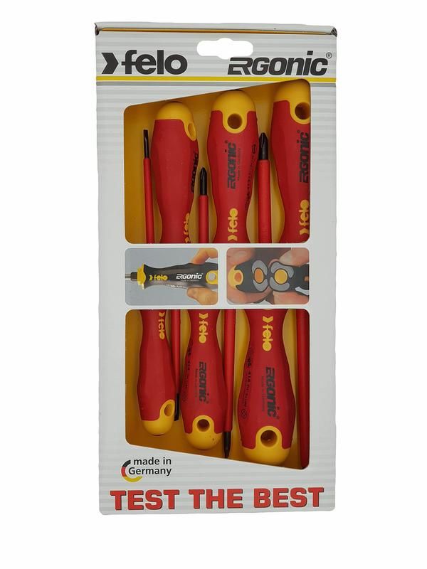 Набор диэлектрических отверток FELO ERGONIC из 6 предметов. ERGONIC - первая в мире рукоятка, адаптирующаяся под руку пользователя. Гладкая ручка без шва и эргономичная форма рукоятки позволяют комфортно работать. Дизайн рукоятки не позволяет инструменту скатываться с поверхности. Отверстие в рукоятке предназначено для передачи дополнительного усилия на инструмент и удобства его хранения. Для удобства пользователя на верхней части рукоятки указан тип шлица. Износостойкость диэлектрический отвёрток набора превышает технические требования DIN и ISO более, чем на 100 %. Состав набора: Отвертка SL 413 3,0x100 / 4,0x100 / 5,5x125 / 6,5x150 Отвертка PH 414 PH 1x80 / PH 2x100