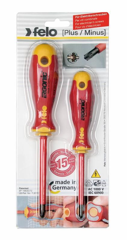Набор диэлектрических крестовых отверток Felo предназначен для проведения электромонтажных работ под напряжением до 1000 Вольт. ERGONIC - первая в мире рукоятка, которая адаптируется под руку пользователя. Её гладкая бесшовная ручка и эргономичная форма рукоятки увеличивают комфорт при работе. Дизайн рукоятки не позволяет инструменту скатываться с поверхности, а отверстие в рукоятке изделия позволяет применять дополнительное усилие при работе в качестве рычага. На верхней части рукоятки указан тип шлица. Ударопрочный стержень отвёртки проходит по всей длине рукоятки. Стержень изготовлен из хром-молибден-ванадиевой стали, закалённой в масле, износостойкость которой превышает технические требования европейских стандартов DIN и ISO. Состав набора: Отвертка PZ1x80, PZ2x100.