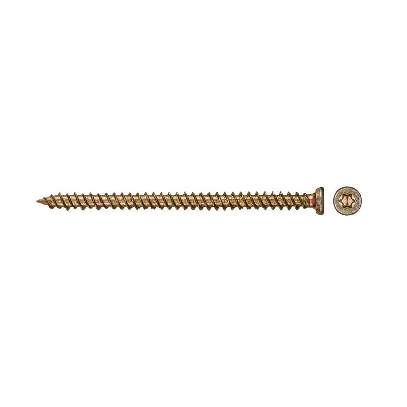 Шуруп по бетону FRS-S имеет потайную головку с насечками для раззенковки и шлицем TORX 30, двухзаходную самонарезающую резьбу и острый наконечник. Изготовлен из углеродистой стали, покрытие – желтый цинк. Предназначен для крепления оконных и дверных коробок из ПВХ, дерева и алюминия к плотным основаниям (бетон, кирпич, природный камень) с предварительным сверлением без применения дюбеля.